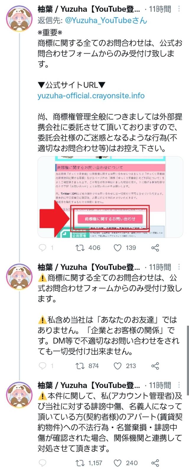 柚葉は同日YouTubeにも商標使用に関する要綱の動画版を投稿。この動画の概要欄では、