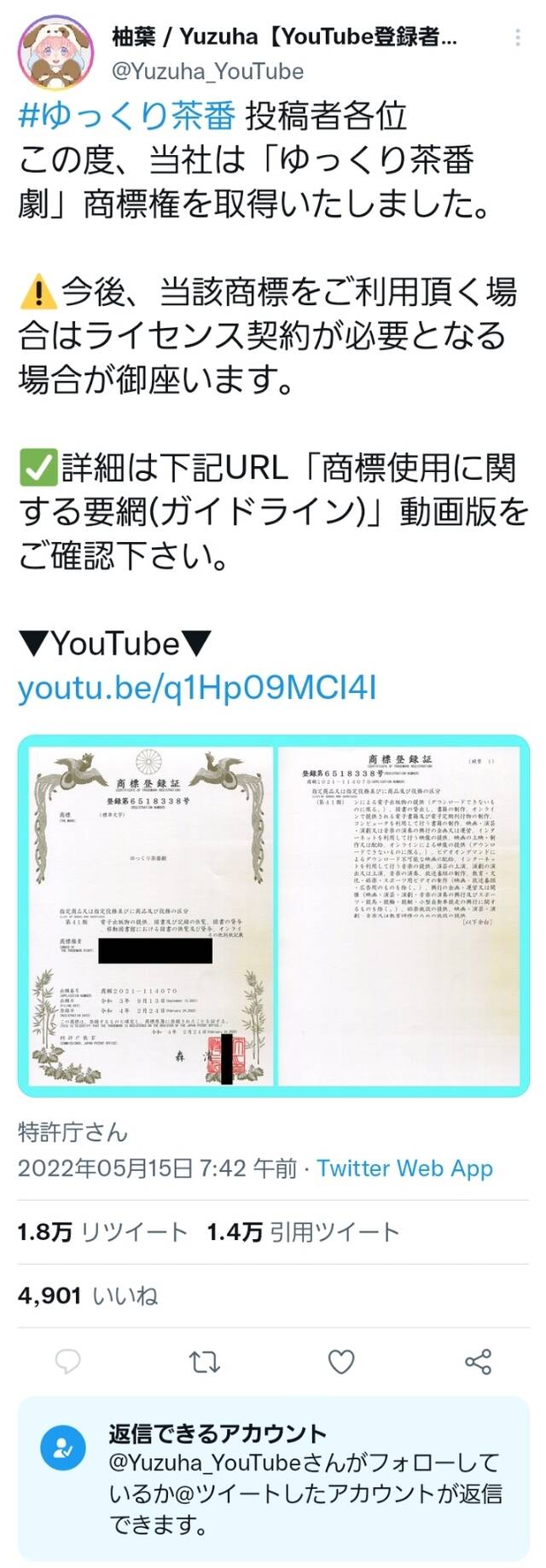 5月15日、YouTuberの「柚葉」(登録者数22万人)が「ゆっくり茶番劇」の商標権を取得したと発表し、大きな波紋を呼んでいます。